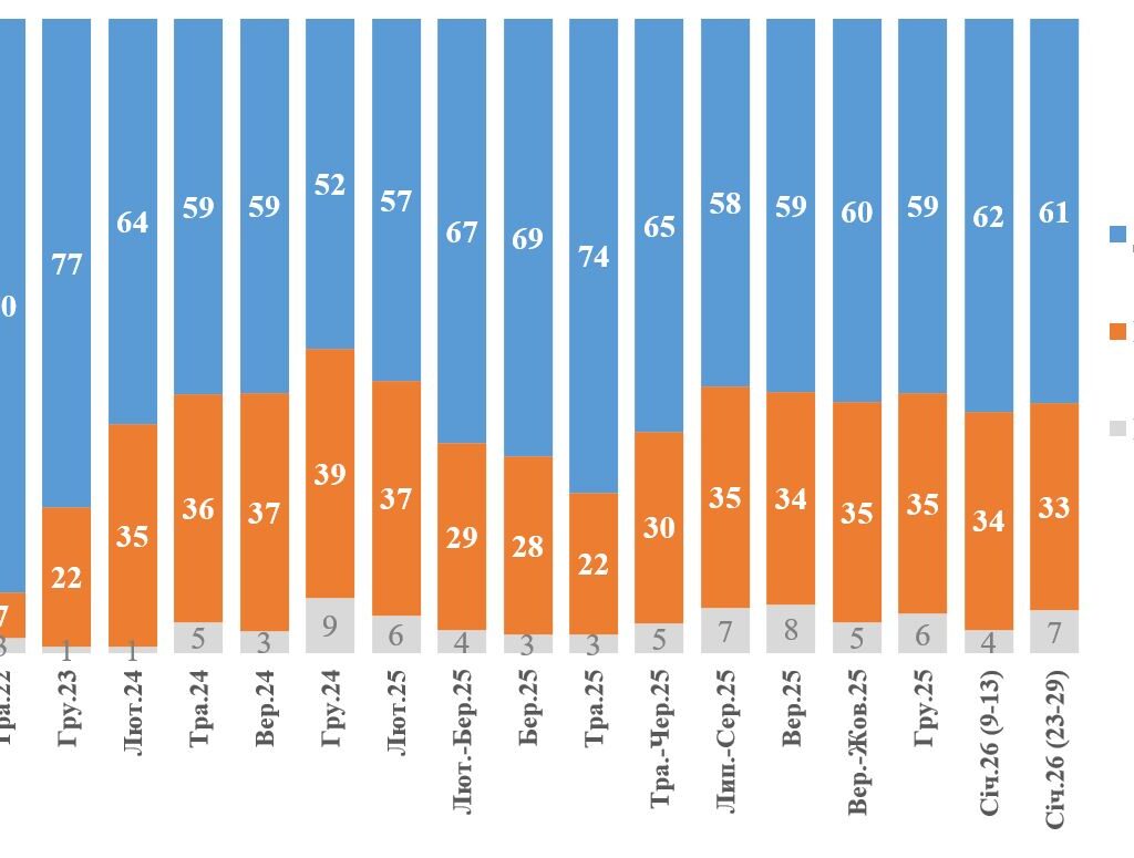 Баланс довіри-недовіри становить +28%, адже не довіряють Президенту – 33% українців. У середині січня 2026 року показники були майже ідентичні. Такі дані наведені в прес-релізі від Київського міжнародного інститут соціології (КМІС).