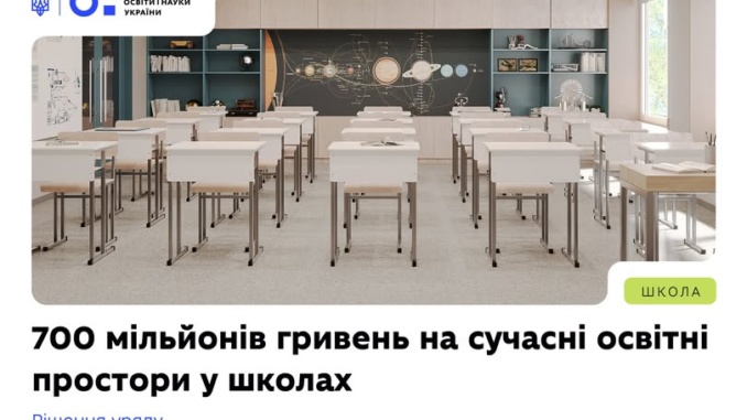 Кабінет Міністрів України затвердив порядок надання субвенції обсягом 700 млн грн на облаштування сучасних освітніх просторів у закладах освіти. Йдеться про реалізацію реформи «Профільна» — третього етапу впровадження «Нової української школи».