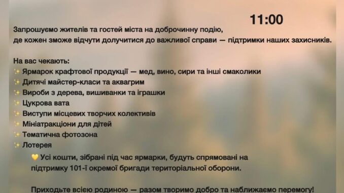 Усі кошти, зібрані під час заходу, будуть передані на потреби 101-ї окремої бригади територіальної оборони. Приходьте всією родиною — разом творімо добро та наближаймо перемогу!