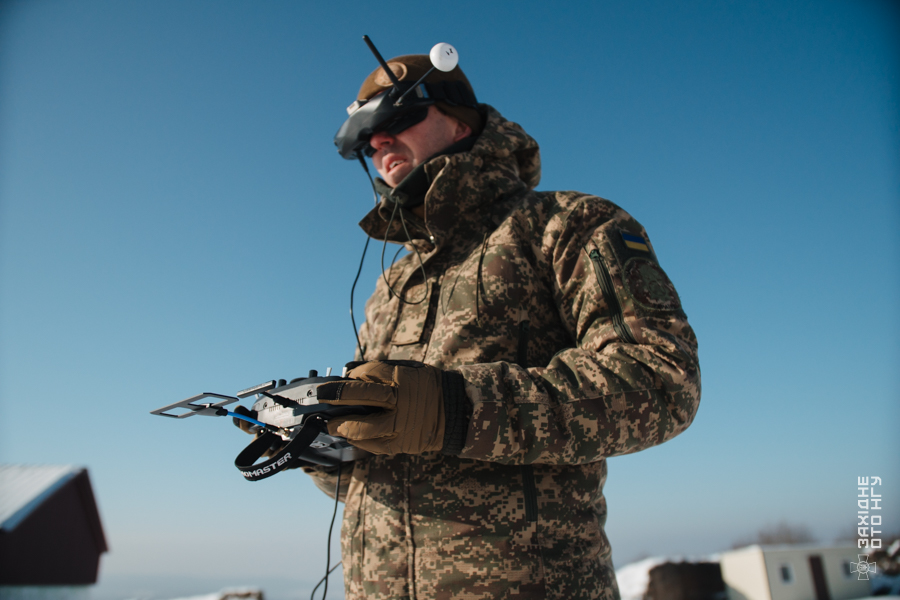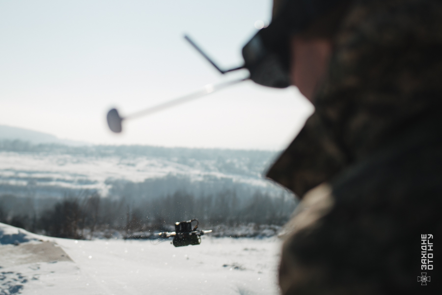 Під час тренування бійці пересуваються зі зброєю по снігу, долаючи нерівності та глибокі замети. Під час перебіжок піхотинців оператори БпЛА імітують атаки FPV-дронів противника – зупинки, укриття та зміна напрямку руху відпрацьовуються як елемент тактичної поведінки під загрозою удару з повітря.