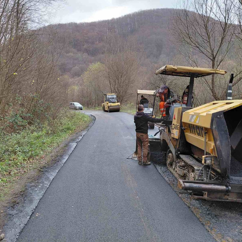 Роботи включають профілювання основи, укладання асфальтобетонного покриття та ущільнення катками.