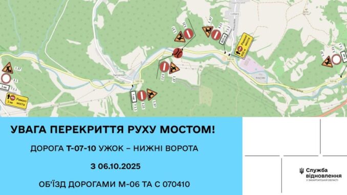 З 6 жовтня 2025 року на Закарпатті буде перекрито рух транспорту через міст на трасі Т-07-10 Ужок – Нижні Ворота.