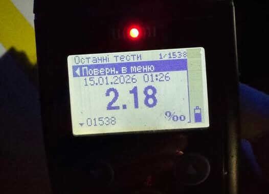Чоловік погодився пройти огляд на місці зупинки. Результат алкотестера показав 2,18 проміле, що майже у 11 разів перевищує допустиму норму. Крім того, інспектори з’ясували, що водій раніше був позбавлений права керування та не виконував рішення суду.