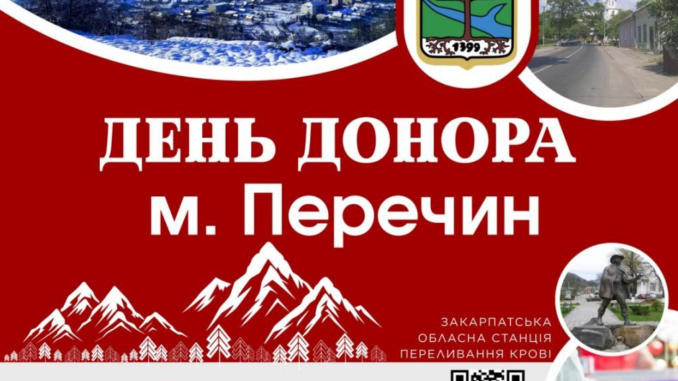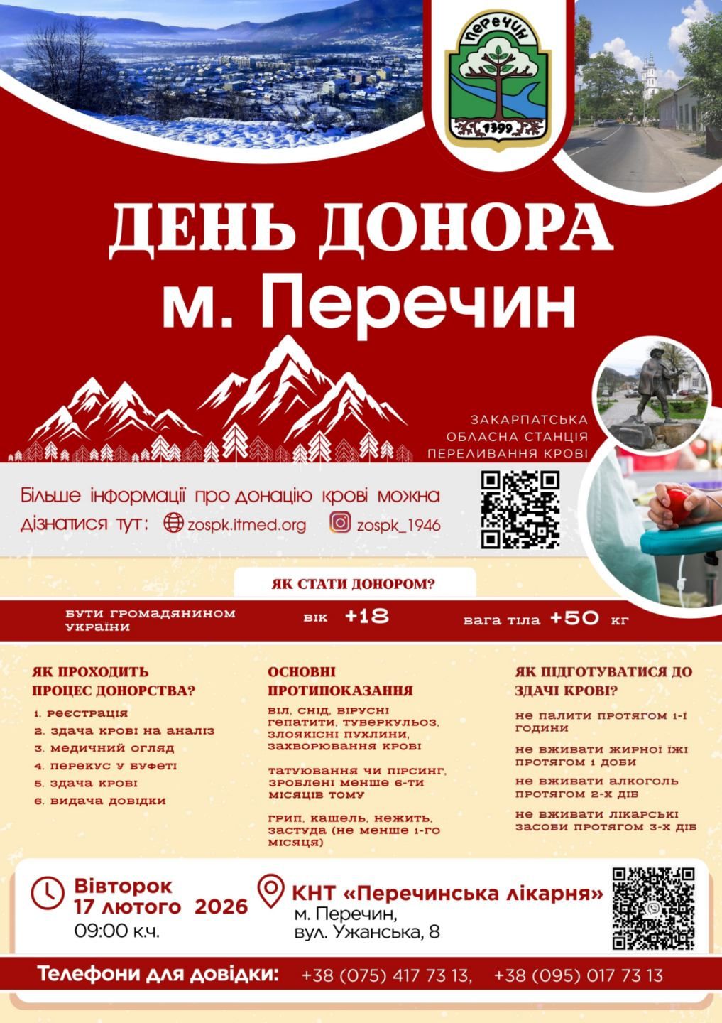 Донорів чекають у вівторок, 17 лютого 2026 року, у КНП «Перечинська лікарня» (1 поверх, вул. Ужанська, 8). Попередня реєстрація обов’язкова за телефоном 095 425 97 34.