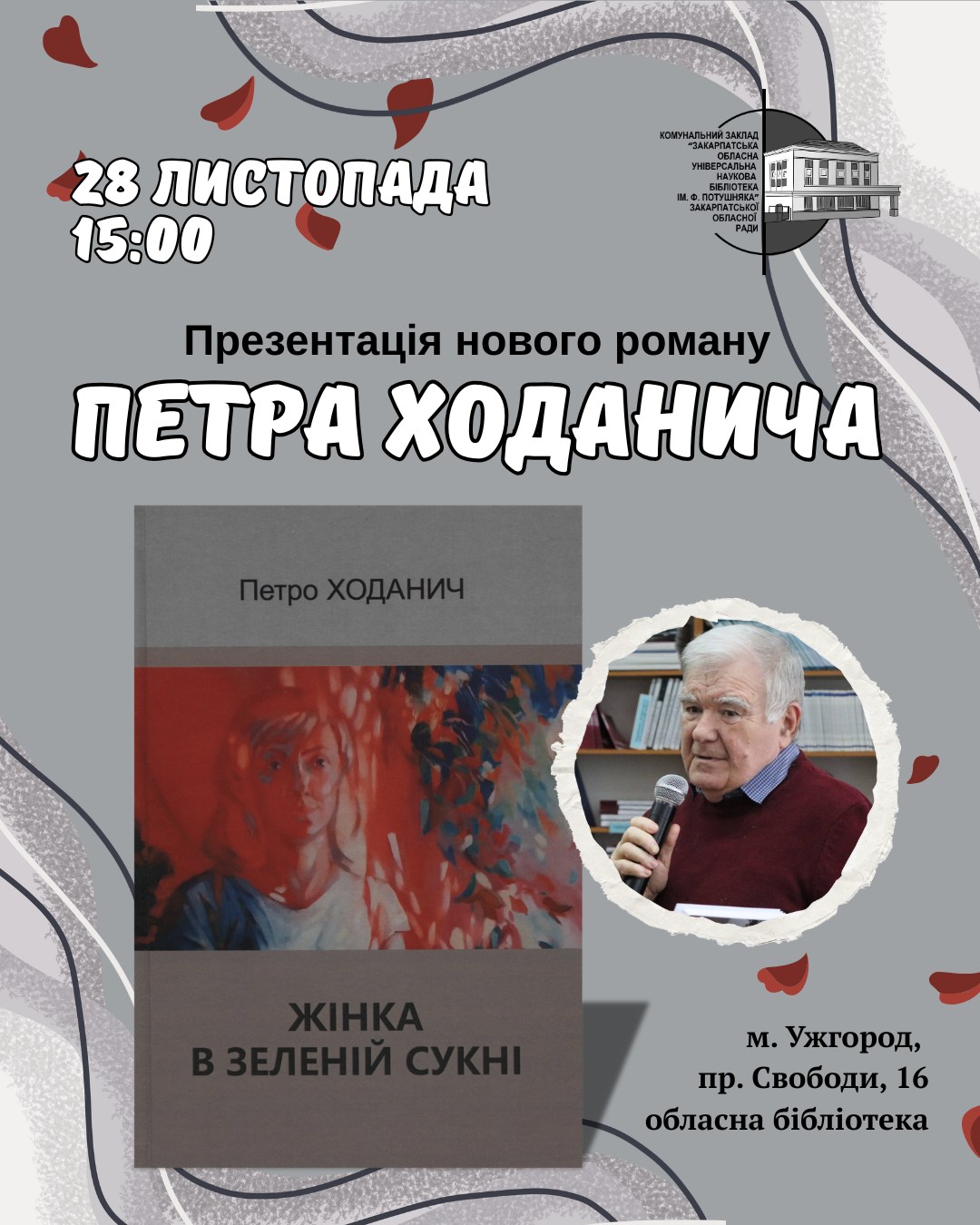 У п’ятницю, 28 листопада, о 15:00 у Закарпатській обласній універсальній науковій бібліотеці ім. Ф. Потушняка відбудеться презентація нового роману письменника Петра Ходанича «Жінка в зеленій сукні».