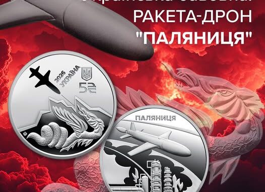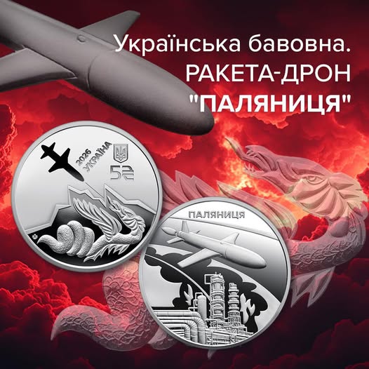 Йдеться про монету «Українська бавовна. Ракета-дрон “Паляниця”», яка символізує сучасну силу та інноваційність українського війська.