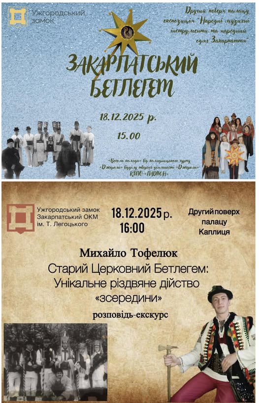 18 грудня о 15:00 відбудеться відкриття виставки «Закарпатський бетлегем», присвяченої традиційним різдвяним забавам і колядницьким дійствам, що збереглися донині. Центральне місце в експозиції займають «бетлегеми» — унікальне поєднання театралізованої коляди, народного мистецтва та релігійної символіки.