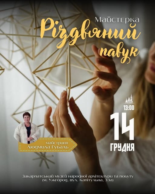14 грудня о 13:00 в Закарпатському музеї народної архітектури та побуту відбудеться майстер-клас із виготовлення «різдвяних павуків». Це оригінальна святкова прикраса з соломи, що здавна прикрашала українські оселі на Різдво та Новий рік. Її форма нагадує великий ромб із підвішеними до нього меншими фігурами, що символізують гармонію та порядок у домі.
