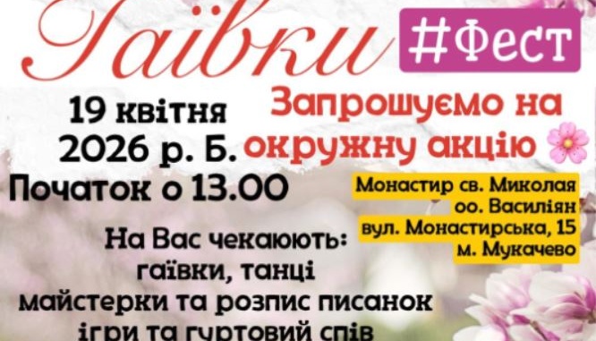 Святкування пройде на території Мукачівський Василіянський монастир Святого Миколая. У програмі — весняні пісні, гаївки, хороводи та традиційні народні ігри, які створять особливу атмосферу свята.