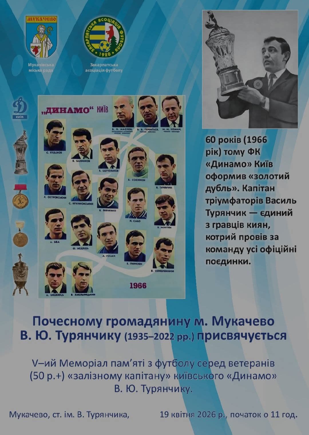 У Мукачеві 19 квітня відбудеться V-й турнір пам’яті Василя Турянчика — легендарного гравця та «залізного капітана» Динамо Київ.