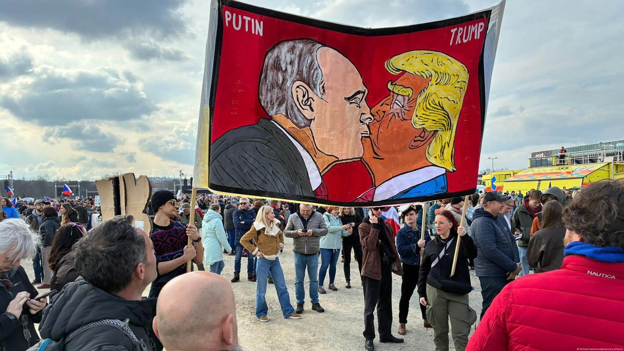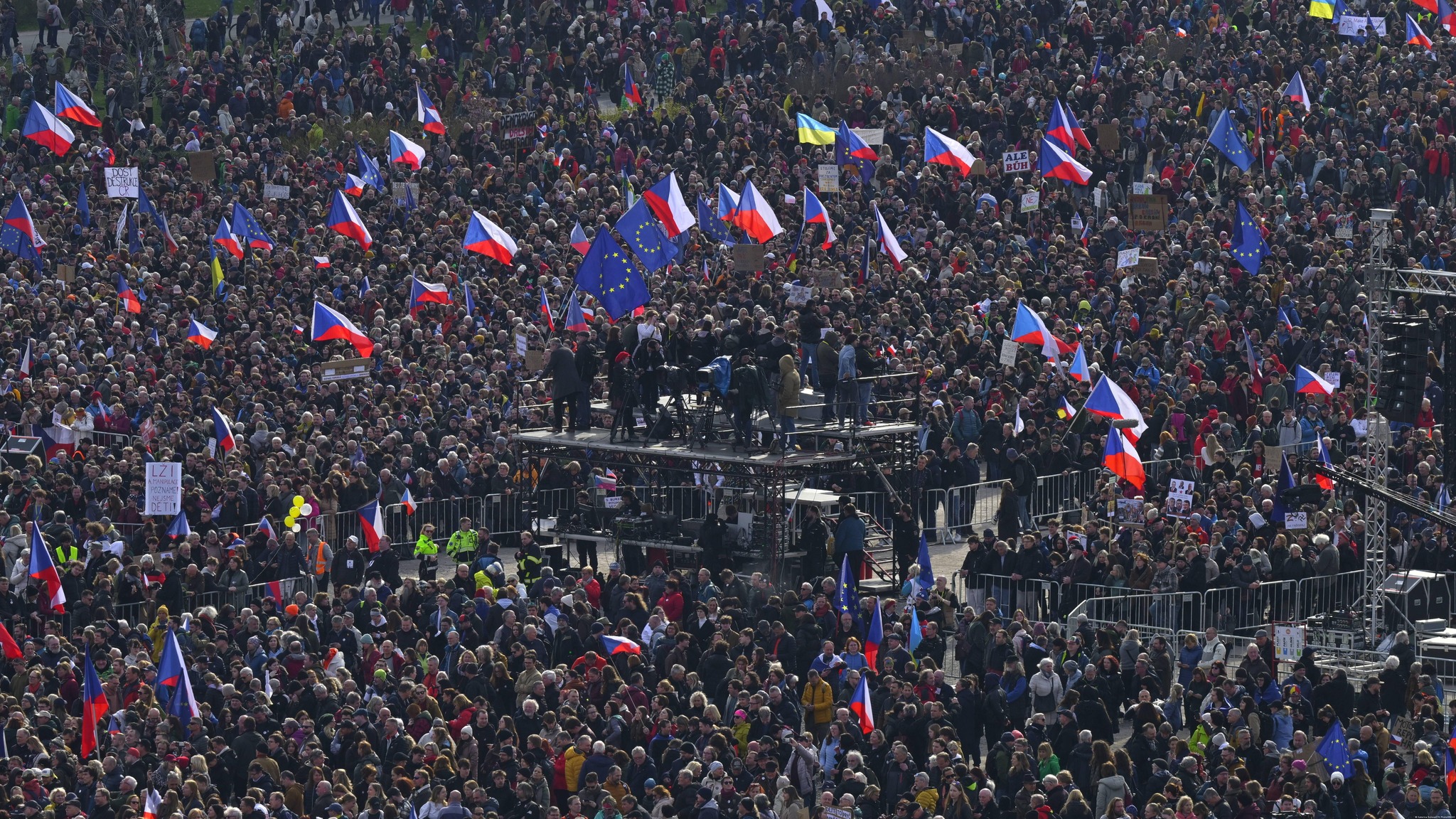 Під час мітингу учасники тримали державні прапори Чехії, символіку Європейського Союзу, а також подекуди — українські прапори.
