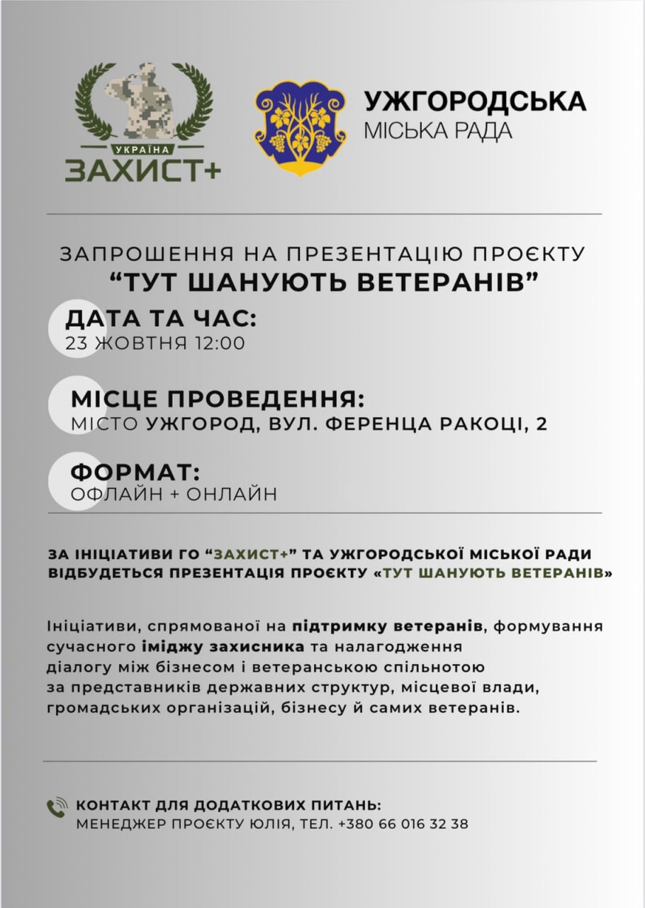 23 жовтня в Ужгороді презентують національний проєкт «Тут шанують ветеранів» — ініціативу, яка покликана змінити культуру взаємодії з ветеранами та посилити їхню підтримку після повернення з фронту.