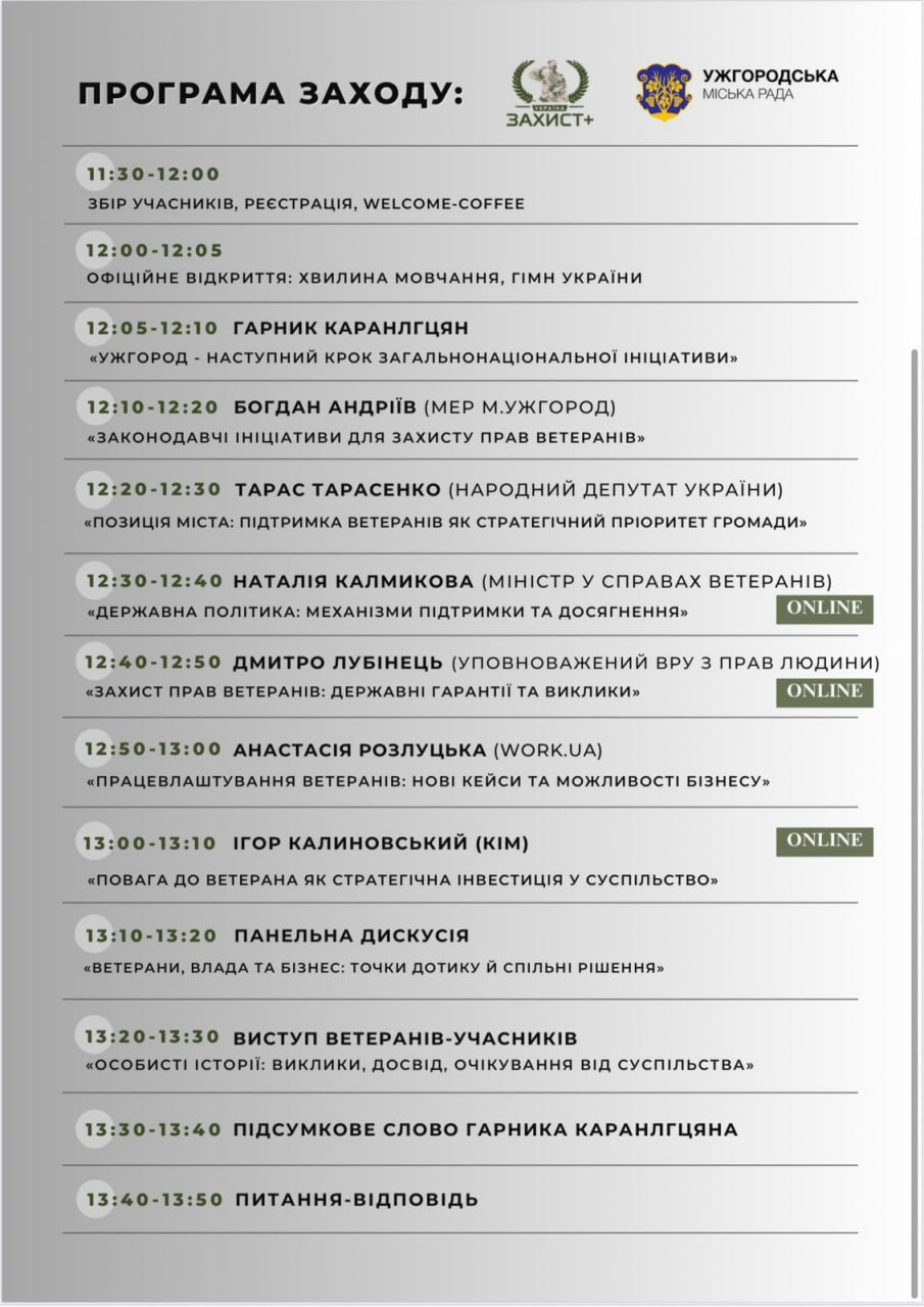 Захід пройде у змішаному форматі — офлайн та онлайн. У програмі: виступи представників центральної та місцевої влади, бізнесу, ветеранів, панельна дискусія, а також презентація можливостей для партнерів.