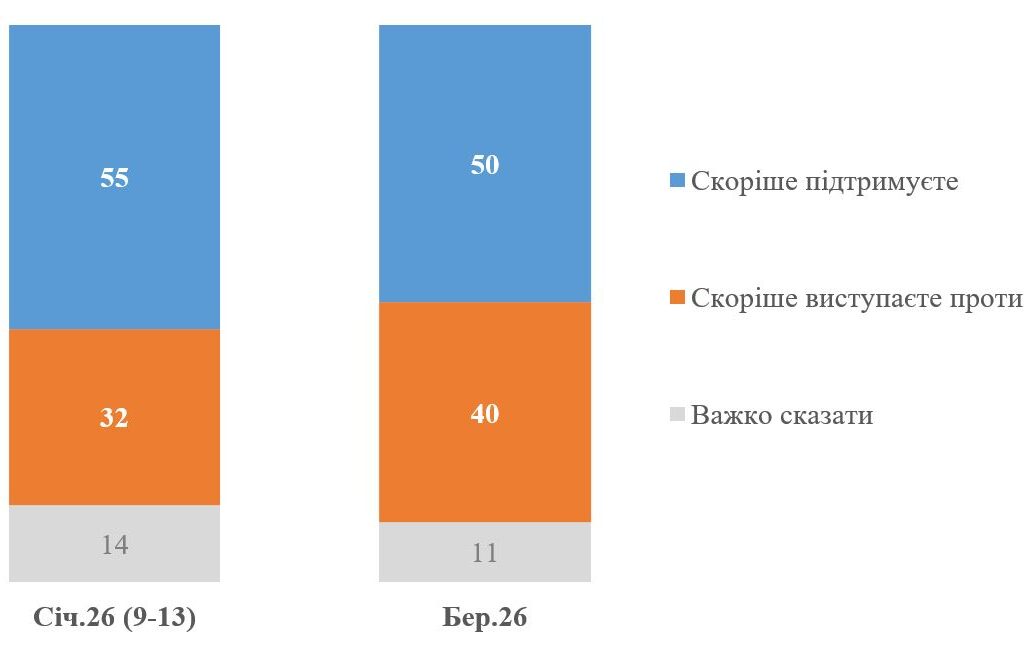 Відносна більшість українців підтримують ідею проведення референдуму, хоча є тенденція до погіршення ставлення до цієї ідеї. Так, порівняно з серединою січня 2026 року з 55% до 50% стало менше тих, хто підтримують таку ініціативу. Натомість з 32% до 40% стало більше тих, хто виступає проти. Такі дані опубліковано Київським міжнародним інститутом соціології (КМІС).