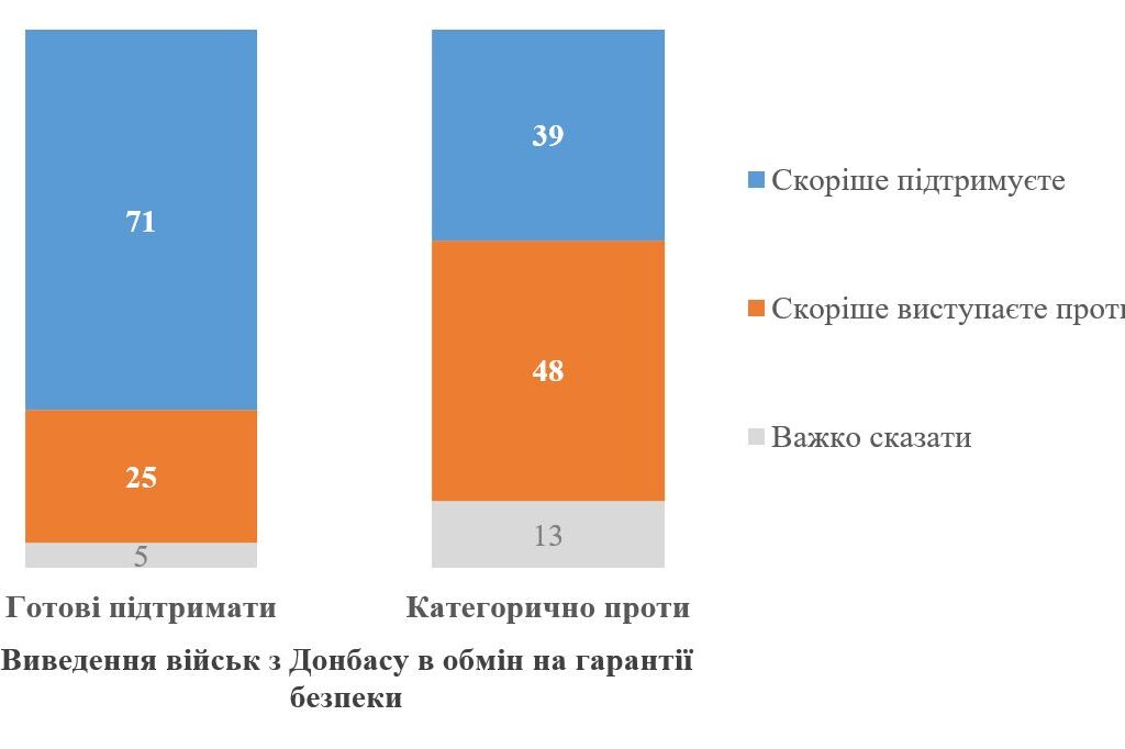 Соціологи зазначають, що з січня 2026 року ставлять запитання, чи готові українці на виведення військ з Донбасу в обмін на гарантії безпеки від США і Європи. Останні опубліковані результати стосуються періоду на середину лютого 2026 року, і згідно з ними 57% українців вважали таку пропозицію категорично неприйнятною. Водночас 36% готові були її схвалити (хоча й переважно неохоче).