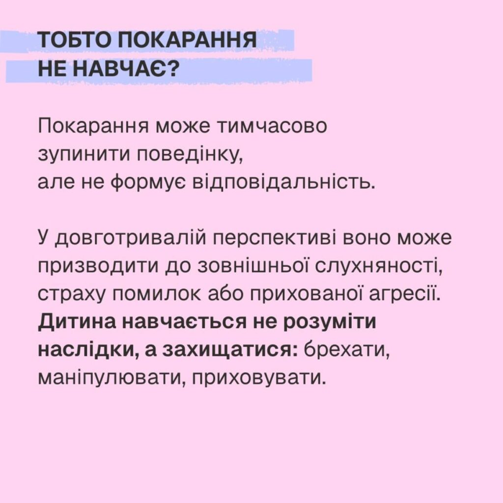У довготривалій перспективі покарання може формувати зовнішню слухняність, страх помилок або приховану агресію. Ну і дитина навчається захищатись – маніпулювати та брехати, щоб уникнути покарання.
