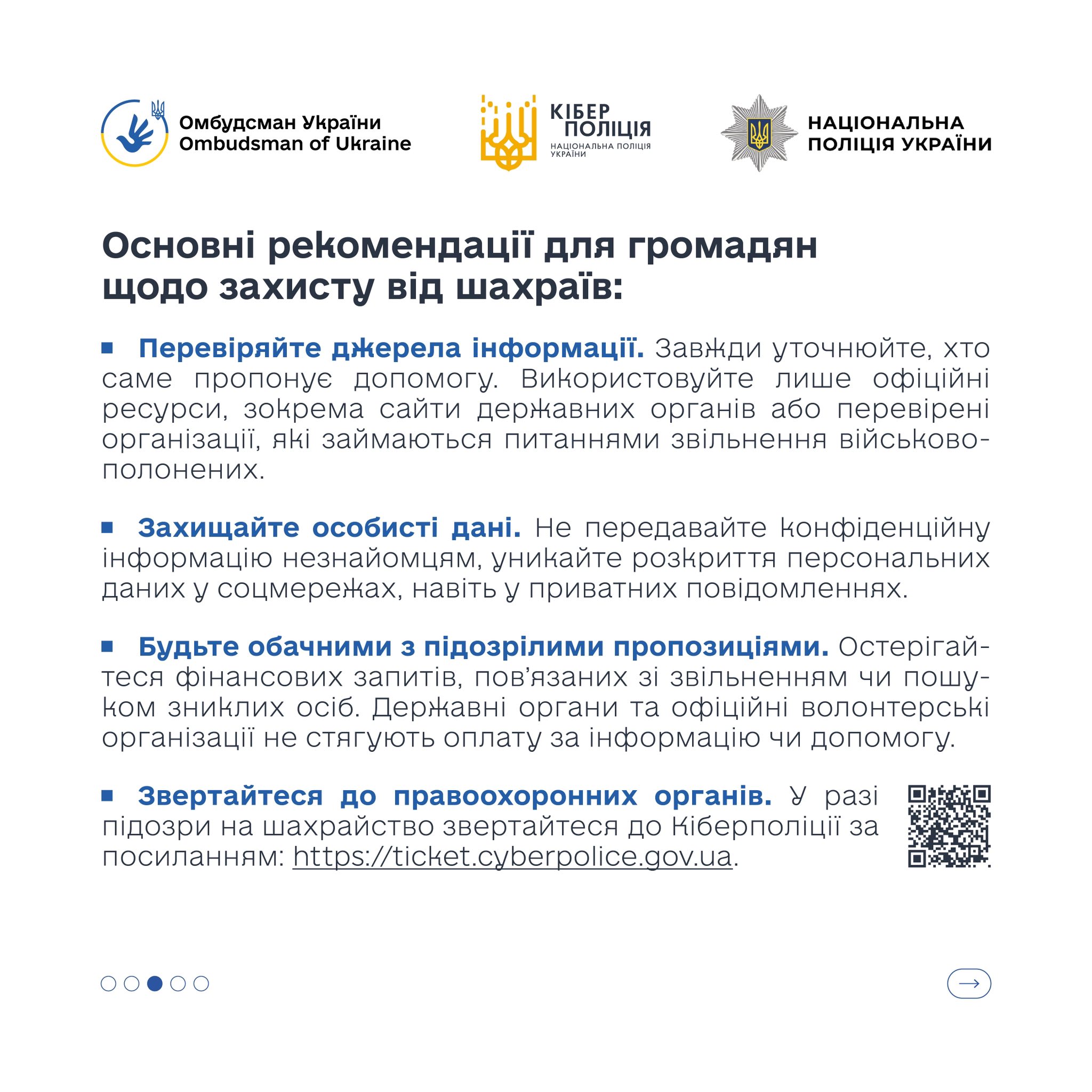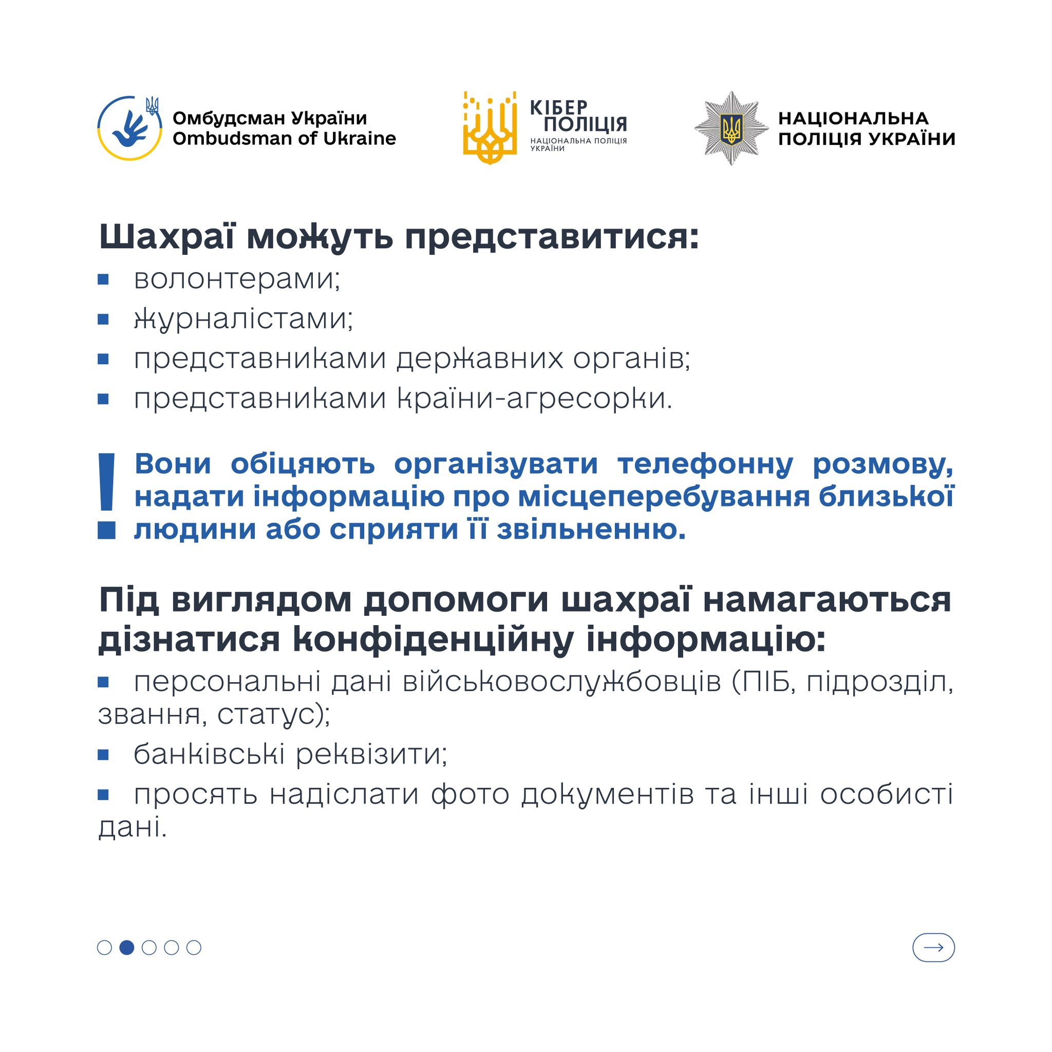 Для запобігання подібним злочинам Офіс Омбудсмана спільно з Кіберполіцією України підготували спеціальну інфографіку, у якій зібрані типові схеми шахрайства та прості правила безпеки для родин військових.