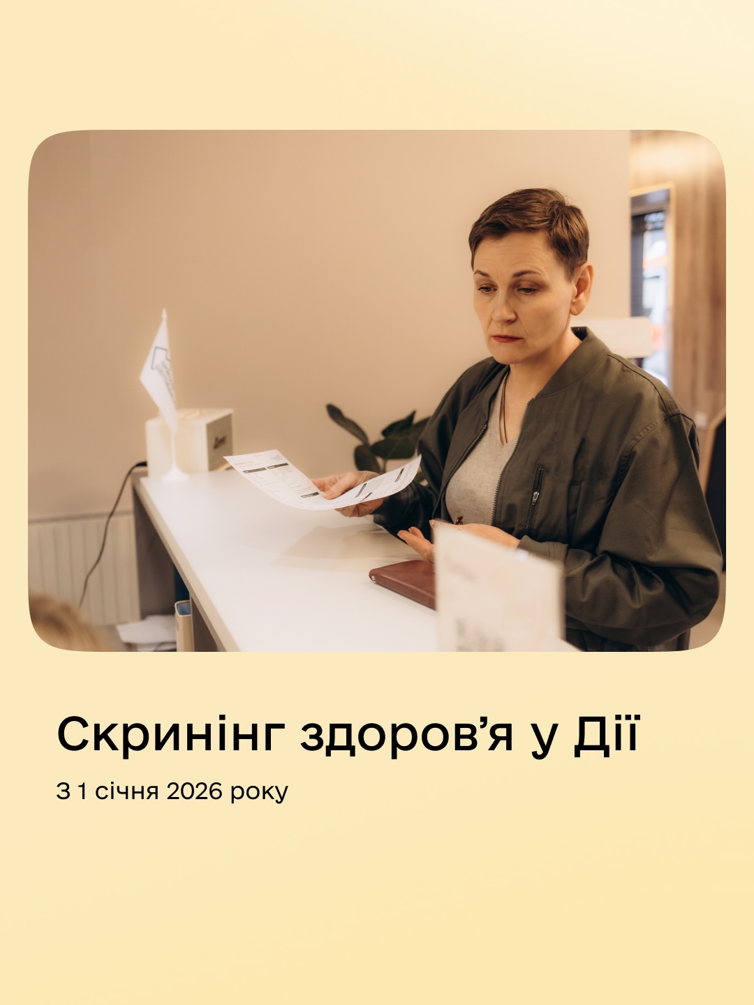 Процес проходження скринінгу максимально спрощено. Усі дії здійснюватимуться через застосунок «Дія», без паперової бюрократії, черг чи тривалих очікувань. Для тих, хто не користується «Дією», передбачена альтернатива: оформлення пластикової Дія.Картки у банках-партнерах та можливість звернутися з нею до найближчого ЦНАПу.