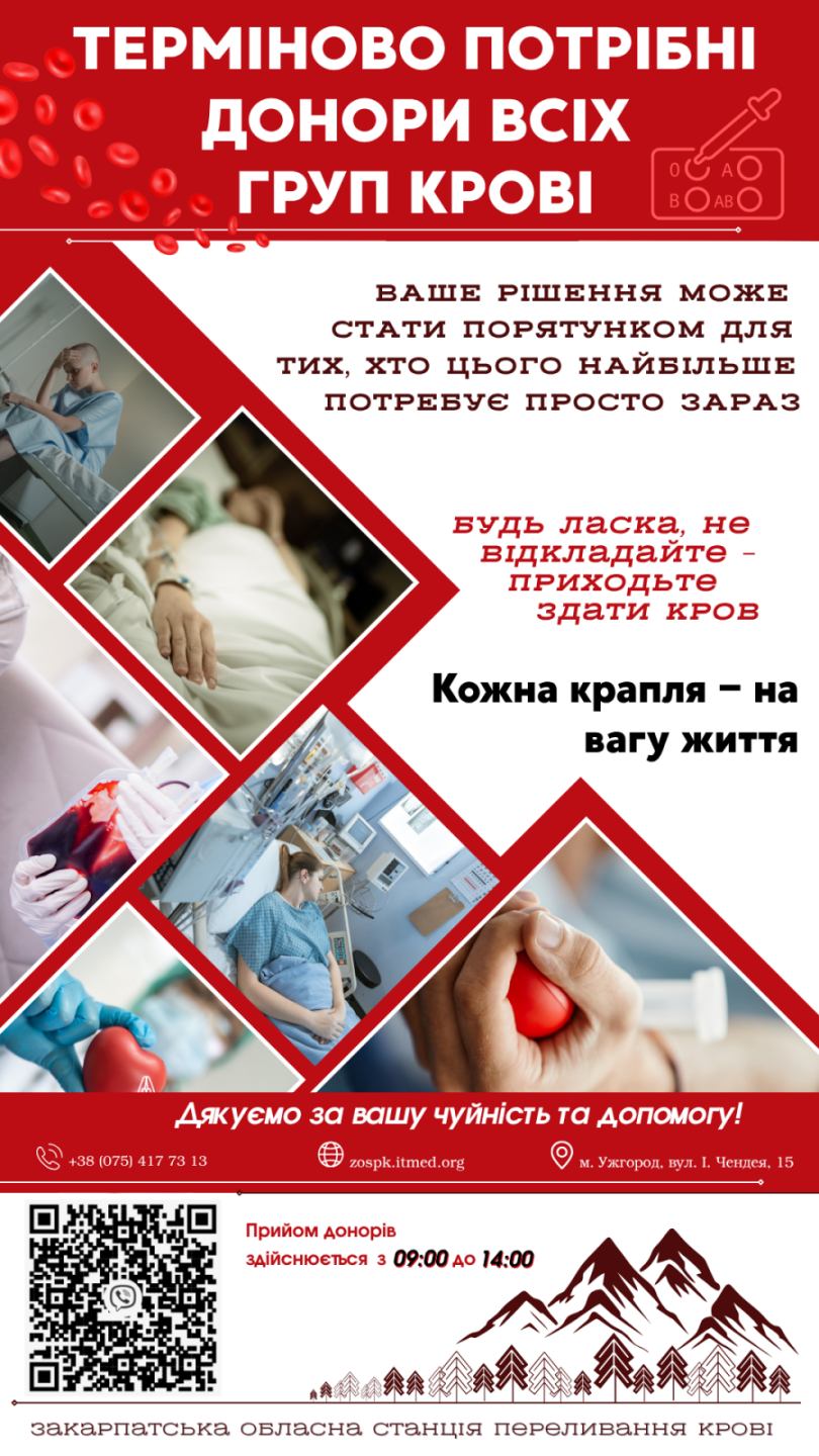 Кожна донація може врятувати не одне життя, тож волонтери та лікарі закликають ужгородців не зволікати. Донорів чекають у місті Ужгород за адресою: вул. Івана Чендея, 15 (колишня Льва Толстого). Контактний телефон: 075 417 73 13.